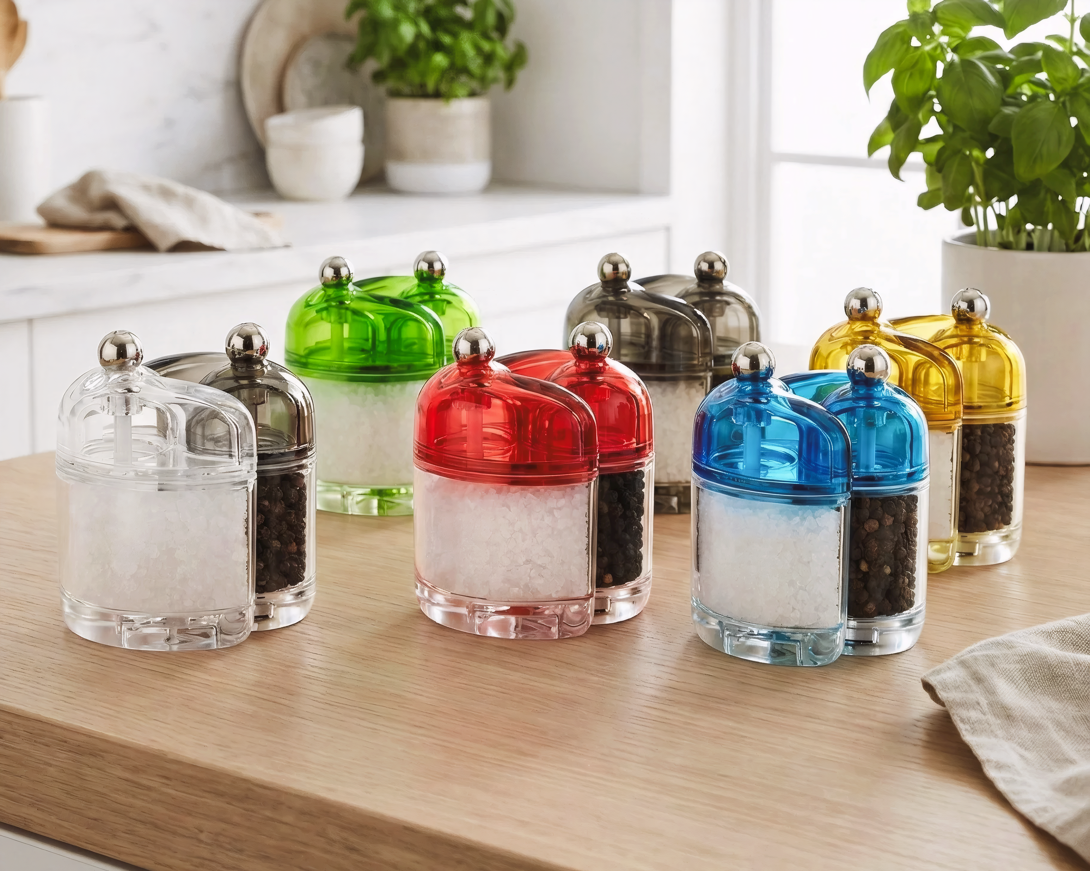 The Condimates collection is one of heritage for Grunwerg. We are delving into our archives for this collection and re-introducing the products with an exciting makeover. Condimates is defined by the interlocking bodies that combine into one unique piece of tableware. The off centre stem creates a crank grind movement with body designed with ergonomics in mind. Presented in 6 striking colours of bright acrylic. The 2 piece Salt & Pepper grinder both feature ceramic grinding mechanism  is resistant to jamming and corrosion caused by exposure to moisture.